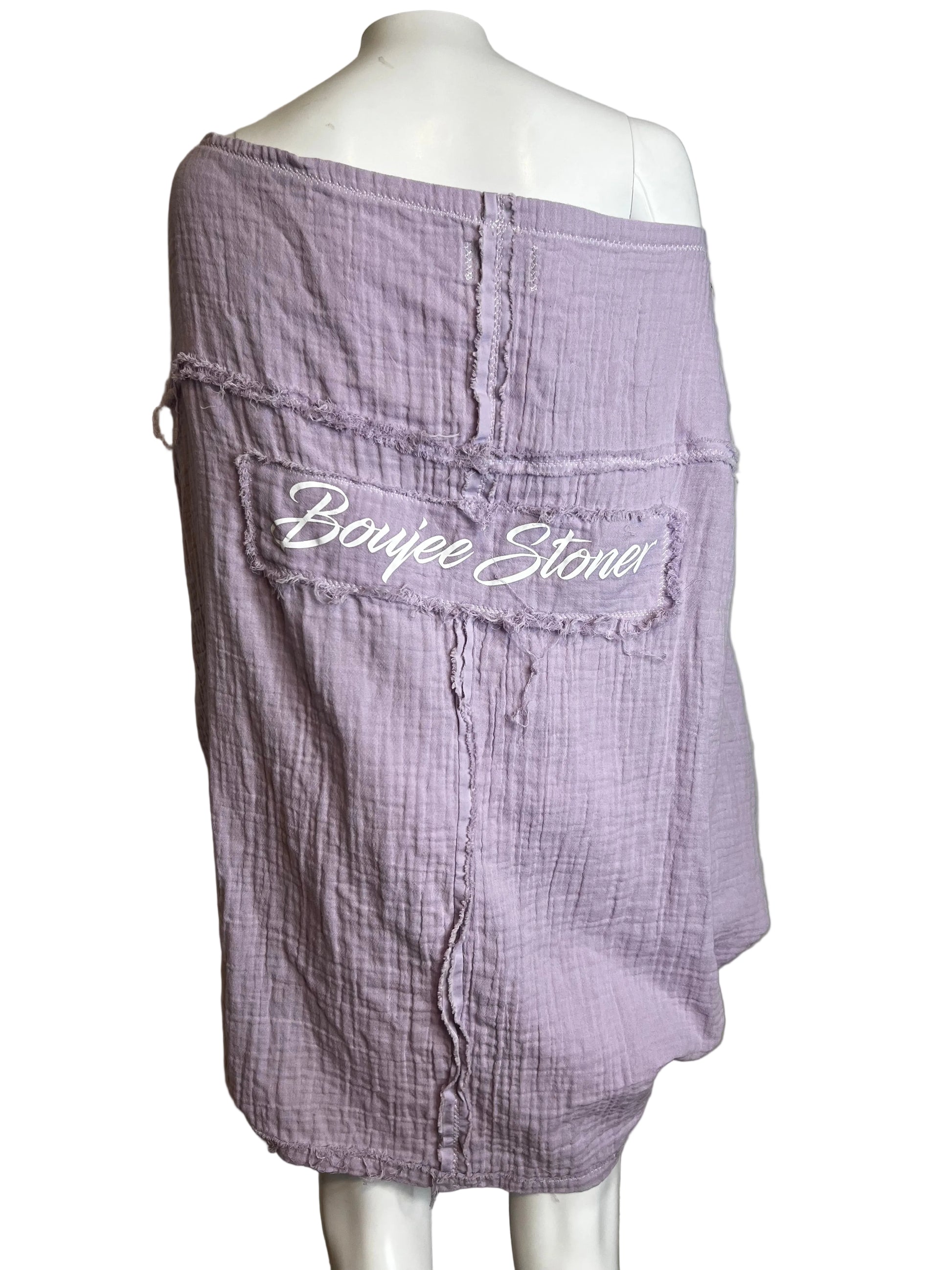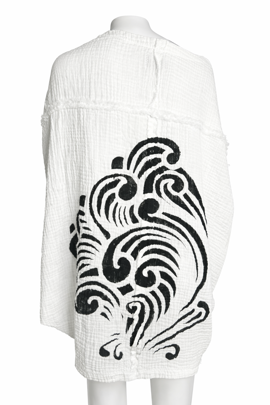 Defined by its off-shoulder neckline and dramatic butterfly sleeves. Each edition is individually constructed by hand-fringed and/or hand painted, making every piece a true wearable work of art.